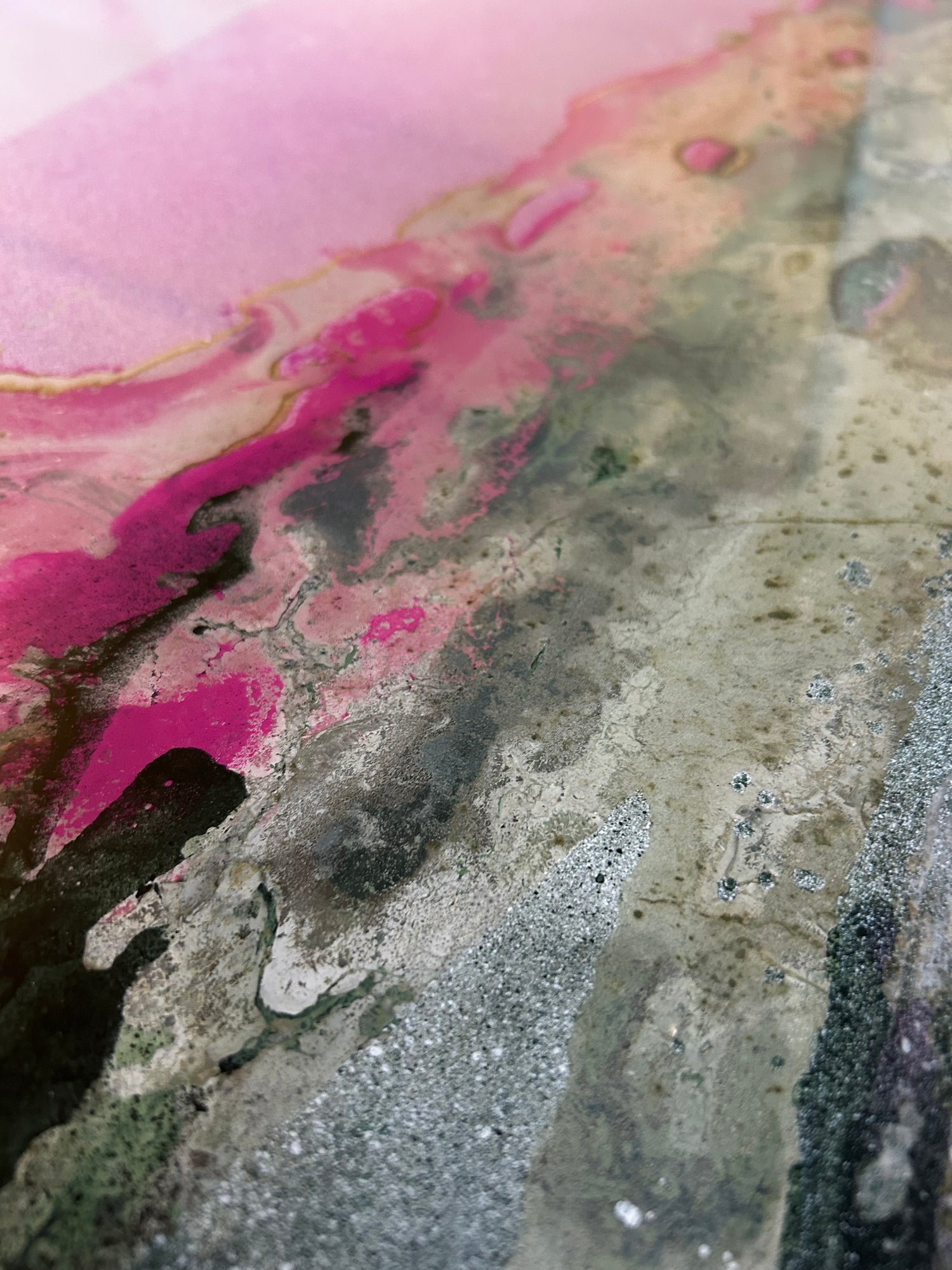 The third pillar is where theory becomes tangible: The Method as Metaphor. My signature technique of painting on the reverse of plexiglass, working blind without visual feedback, is the physical enactment of my philosophy. It is a deliberate renunciation of authorial control in the moment of creation. I establish the conditions but surrender the final visual outcome, allowing the painting to become an independent “object of itself,” revealed only when complete. This process mirrors the photographic development of a latent image, embodying the very revelation it seeks to host, “here and now”.