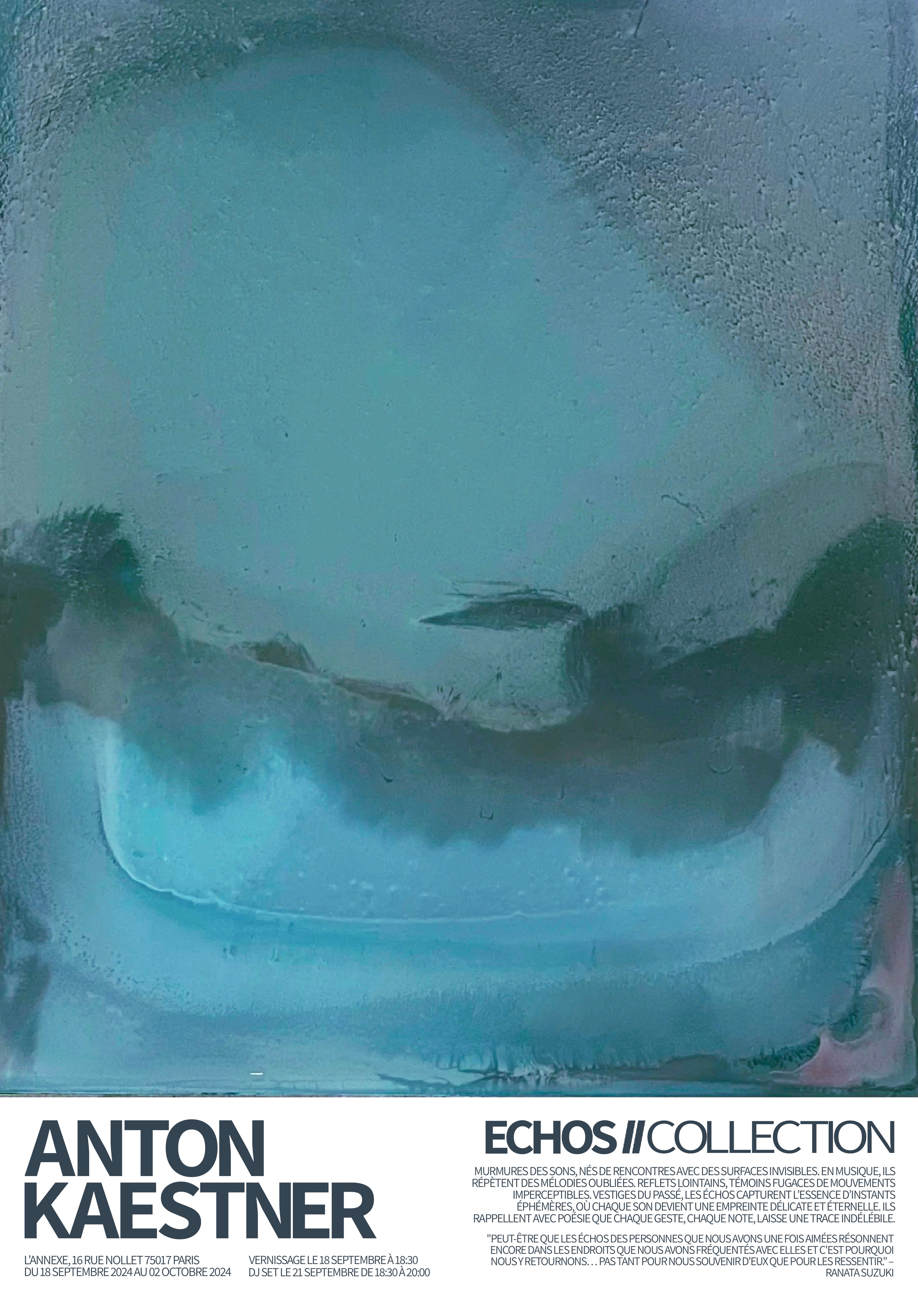 The exhibition "Échos" revealed an intimate and universal facet of contemporary art. Kaestner, by combining abstraction, spirituality and sensory exploration, opens new horizons where the individual is invited to -"lose control and come to your senses"-confront his own perception of the world. His paintings, witnesses and invitations of an introspective journey, capture the quest for meaning and harmony, going beyond the boundaries of the personal to reach the universal.