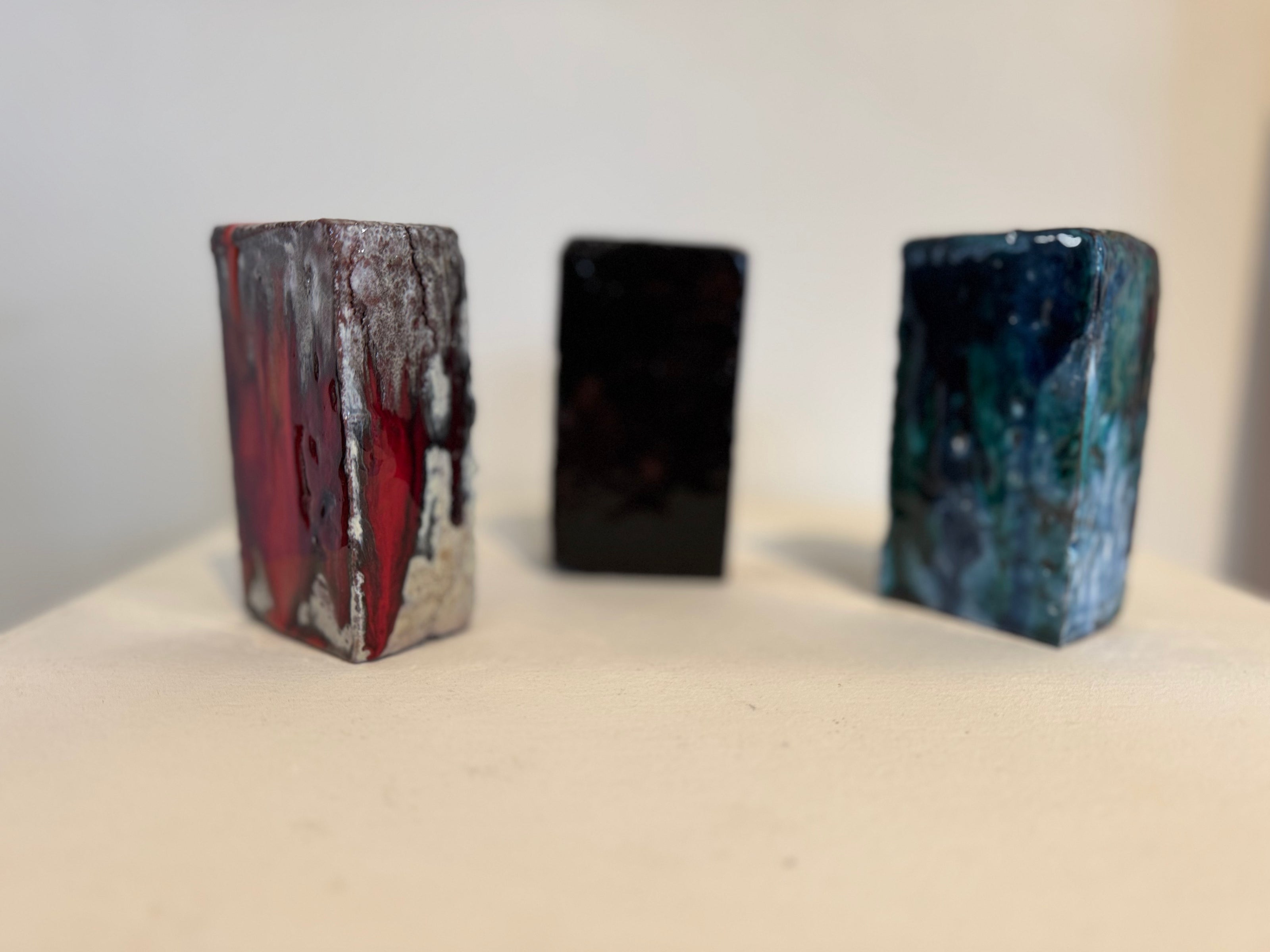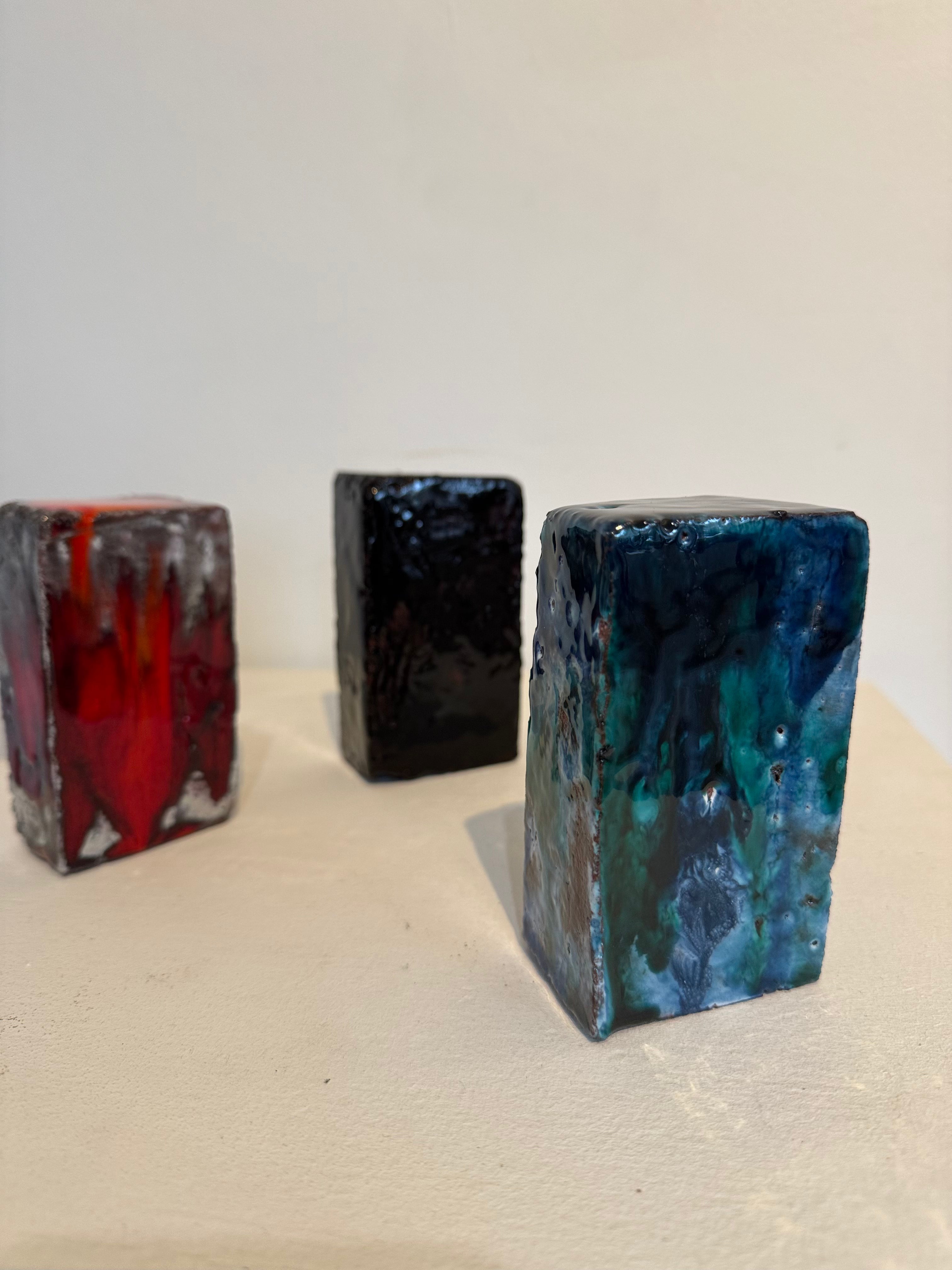 The visual language of this project is rooted in abstraction, though it avoids the pitfalls of overt complexity. Each brick is a self-contained world, yet it is clear that they form part of a cohesive whole. Each sculpture is born from the intention of the artist, the craftsmanship of his partners and, very much like the painting work on plexiglass, the “chance” linked to the creative process both in terms of the enamel and its reaction in the secrecy of the oven during firing at 1000°C.