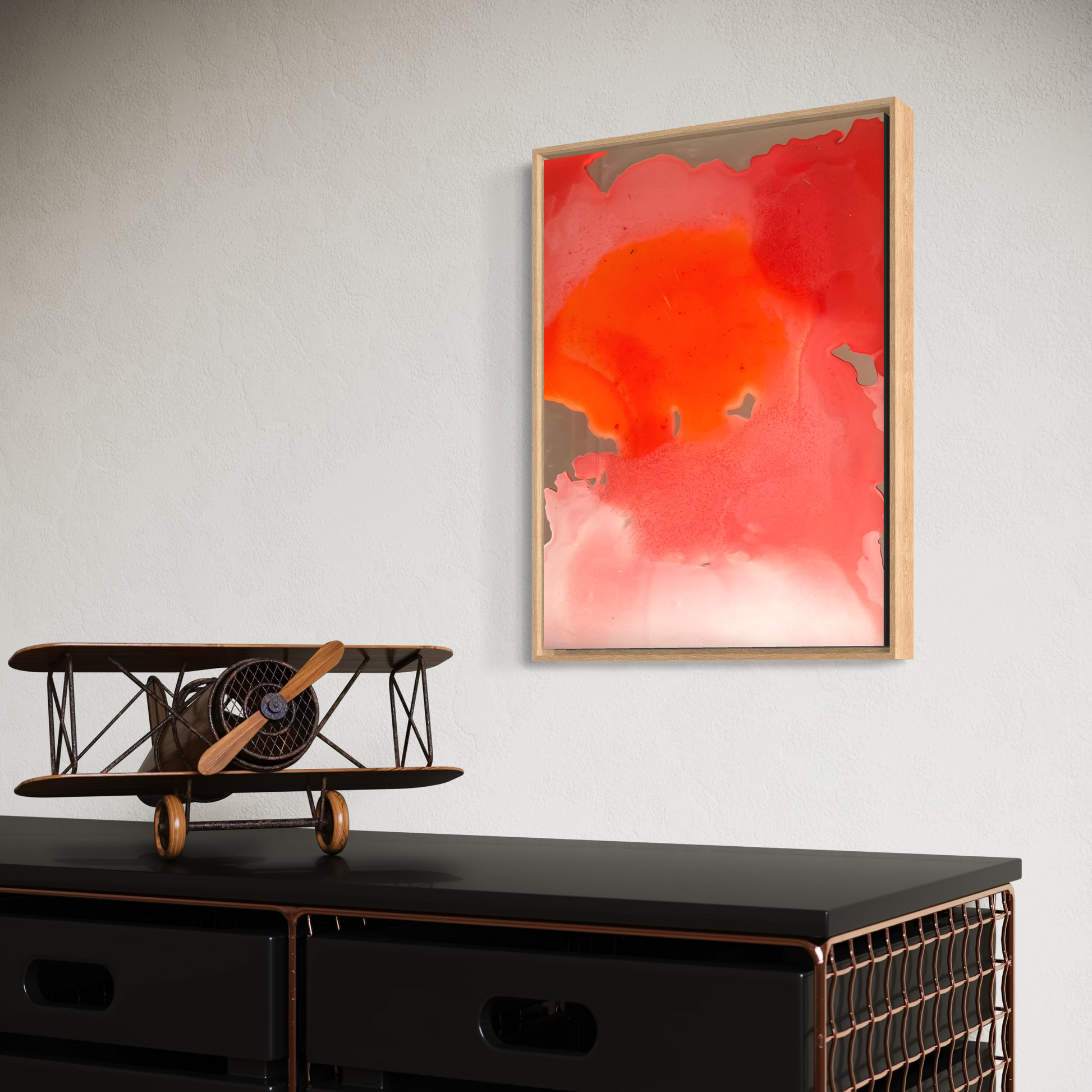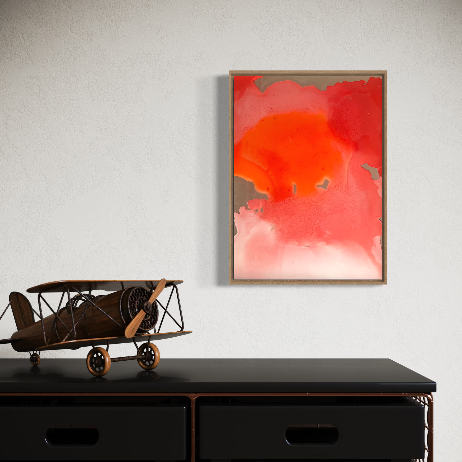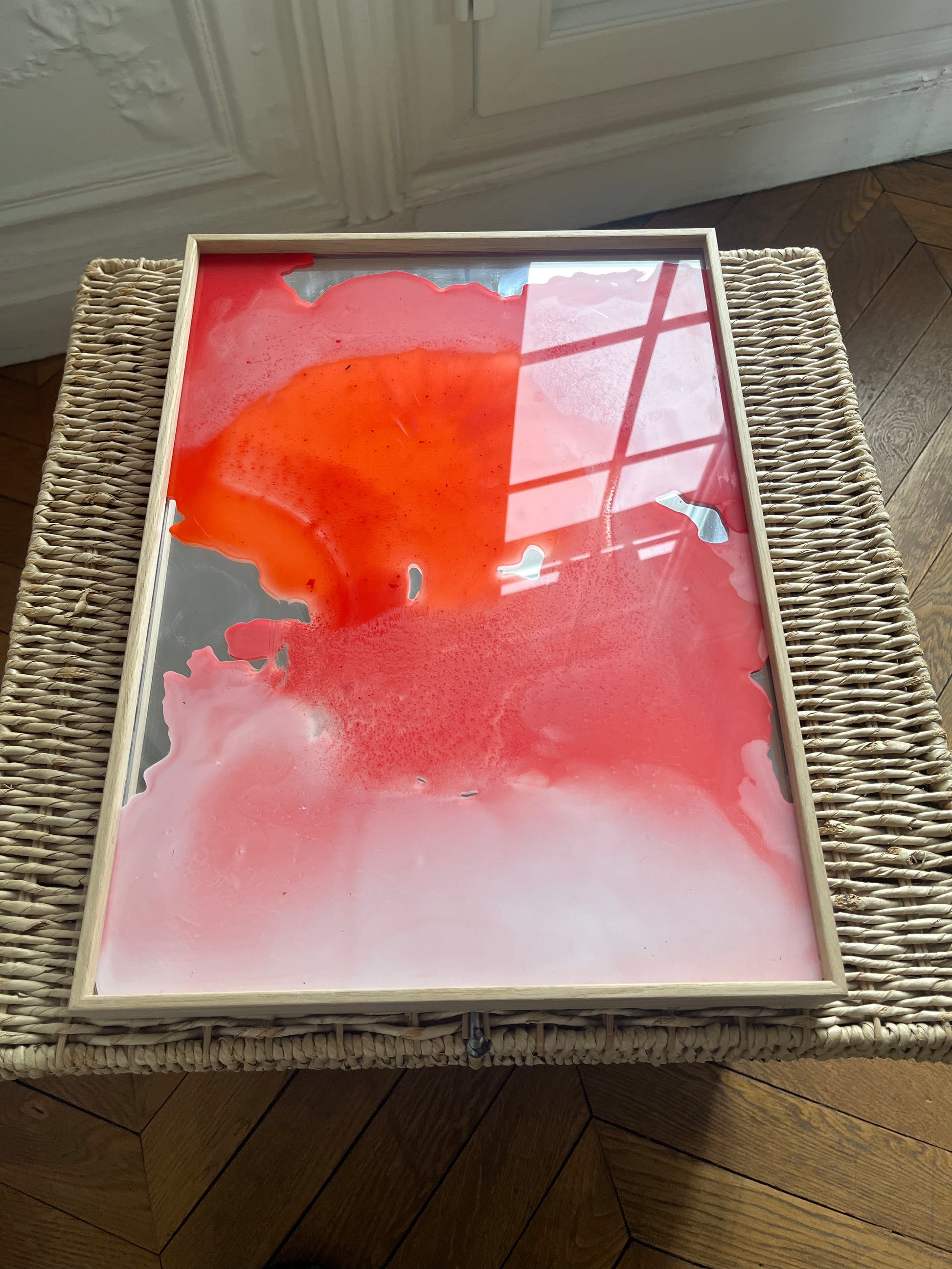 Unique piece, original painting by Anton Kaestner. Acrylic on 2 plexiglass plates, 2mm each with transparency. Inch 17,3 * 12,6 / 44 * 32 * 3 cm. Plates can be re-arranged, producing different art pieces. Natural wood frame (inch 0,23 * 1,18 / 0,6 * 3 cm) included. Certificate of authenticity. Delivery is covered by insurance.