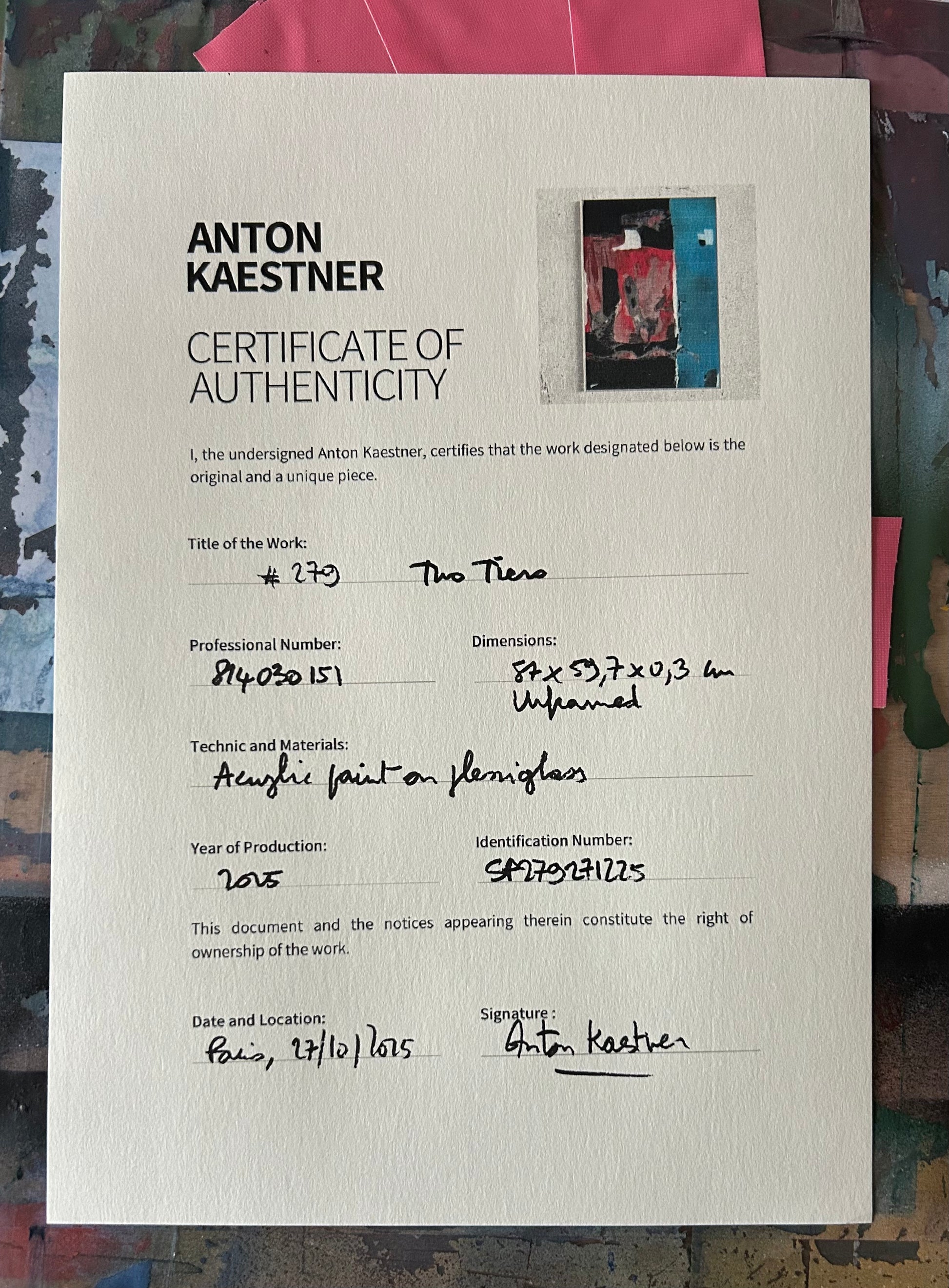 Unique piece, original painting by Anton Kaestner. Acrylic on plexiglass plate 3mm. Inch 34,6 * 23,5 * 1,38 / 87 * 59,7 * 3,5 cm. Nielsen aluminium 34 frame with mat silver finish (inch 0,23 * 1,38 / 0,6 * 3,5 cm) included. Certificate of authenticity. Delivery is covered by insurance.